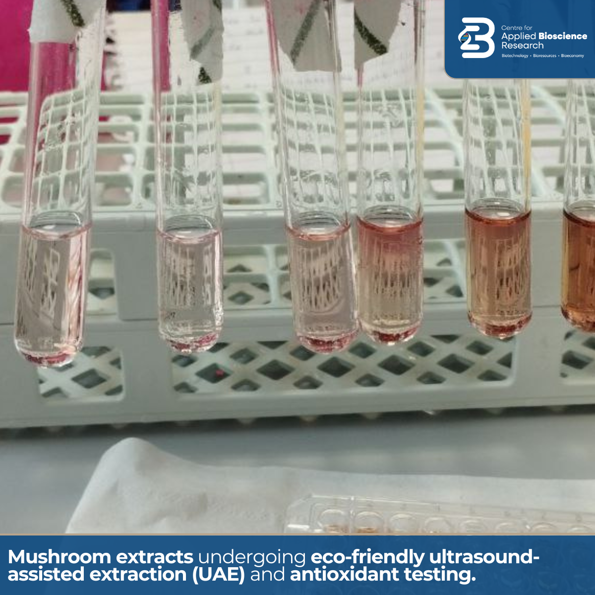 Mehdi’s research focuses on Ultrasound-Assisted Extraction (UAE), an eco-friendly method that uses sound waves and solvent systems to isolate bioactive ingredients from various mushroom species. These extracts are then characterised and assessed for antioxidant activity.