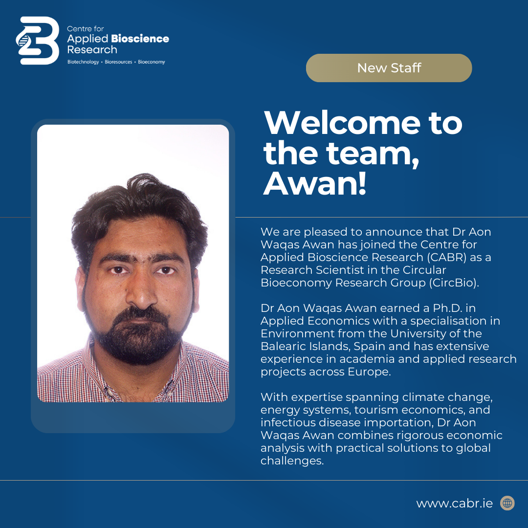 We are pleased to announce that Dr Aon Waqas Awan has joined the Centre for Applied Bioscience Research (CABR) as a Research Scientist in the Circular Bioeconomy Research Group (CircBio).